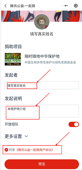 填写『发起者』和『发起说明』(发起者填保护地名称或者保护地主任名称;发起说明填保护地介绍等,无限制)