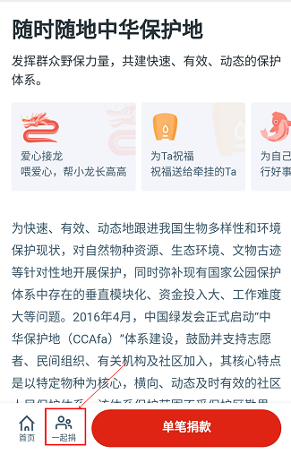 尊敬的中国绿发会中华保护地主任们,绿会研究室近期针对中华保护地项目发起了腾讯乐捐“随时随地 中华保护地”募捐行动,该项目主要用于筹集各个中华保护地开展日常保护活动的基本工作资金,包含志愿者补贴、物料支岀、宣传费用等。各位中华保护地主任可以通过发起该项目的“一起捐”,为自己保护地的保护工作筹集粮草。