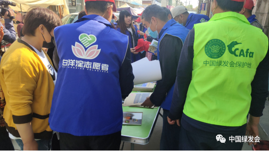 当天上午9时许,绿会研究室代表与“中华水鸟保护地·安新”田主任、“中华大鸨保护地·天津”朱主任等志愿者在大王镇政府汇合,和县政府有关领导简单交流后共同前往镇上社区进行宣传活动,分发关于生态环境保护的科普、宣传资料。现场公众积极性令人感叹,短时间内,数百份环保资料被领取一空。人民生态保护意识在政府+民间力量共同推动下显著提高。