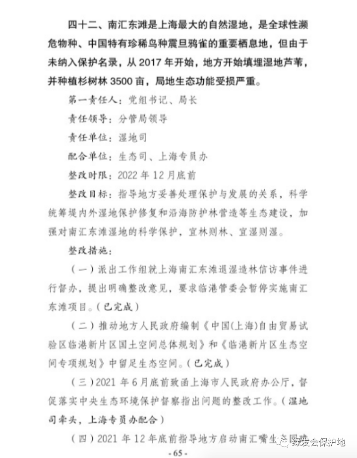 2021年9月1日,国家林业和草原局公开中央生态环境保护督察整改方案。对于南汇东滩湿地“填埋湿地芦苇,种植杉树林”事件,《整改方案》指出,将指导地方妥善处理保护与发展的关系,科学统筹堤内外湿地保护修复和沿海防护林地营造等生态建设,加强对南汇东滩湿地的科学保护,宜林则林、宜湿则湿。同时未来将加大侵占湿地的查处力度,对上海南汇东滩、内蒙古通辽市额仑草原等典型湿地加强监管。